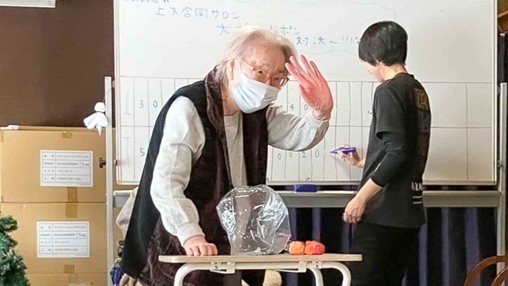 「365歩のマーチ」「憧れのハワイ航路」を歌と体操で楽しみ、自然と笑顔と掛け声が広がりました。